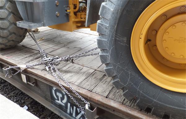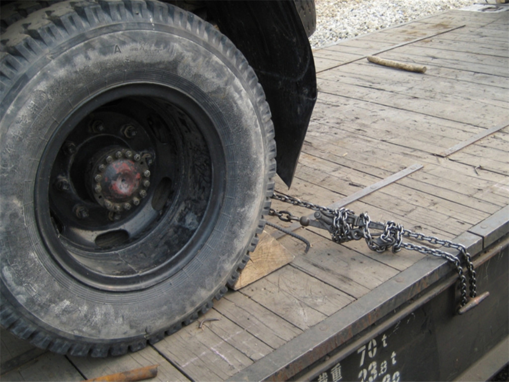 目前,我國鐵路軍事車輛運輸大都采用鐵線、絞棒和三角擋的捆綁加固,這種捆綁加固方法難以適應現代化戰爭軍事運輸的需要。我們研制的杠桿式鏈條緊固器是適應現代化戰爭快速反應所需要捆綁緊固裝置,它用來替代鐵線、絞棒和三角擋木加固。杠桿式鏈條緊固器由固定連桿、活動連桿、緊固杠桿(手柄)、鉸接環、環形掛鉤和鏈條組成。各零部件均采用合金鋼制造,鏈條與連桿采用球型鉸接方式連接。它通過掛鉤鏈條的鏈節掛接形成環型捆綁,掛鉤與不同鏈節的掛接可調整環型捆綁鏈條的松緊,然后利用杠桿的原理通過對緊固杠桿(手柄)加力帶動活動連桿及鏈條對貨物實施捆綁緊固。適用于我國鐵路軍用輪式裝備運輸的捆綁加固。